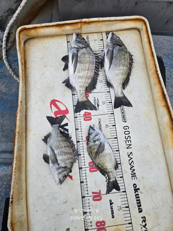 ★감성돔5짜외 일당들 조황★어제 감성돔 52,45 등 조황입니다간만에 5짜가 얼굴을 보여주네요 내일도 오전 10시 출항합니다한작때기하실분 언제라도 연락주십시요